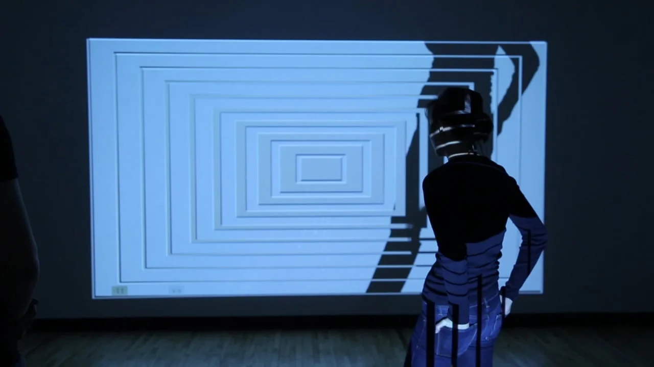 When a person enters the space, his body blocks the lights from the two projectors and hence creates two distinctively sized and situated shadows on one complete -- and once reposing -- image. The completeness of the image is disrupted by the body shadows, and the two shadows, which come from the same body, are disrupted by the projections. The person is placed on an area of multiple dual destruction.